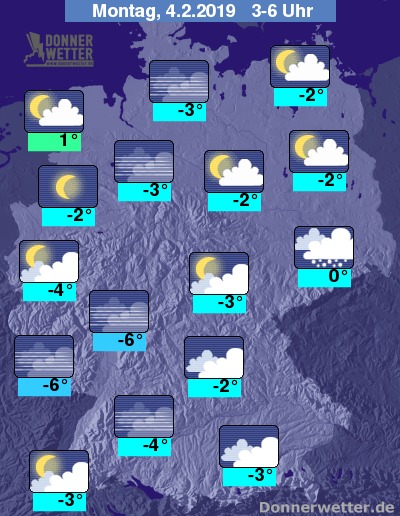 In der folgenden Nacht fällt über Bayern und Sachsen anfangs noch zeitweise Schnee, der jedoch in der zweiten Nachthälfte nach und nach abklingt. Weiter nach Westen hin zeigt sich der Himmel oft locker bewölkt oder sternenklar, dazu bleibt es trocken. Die Temperatur sinkt auf 1 Grad in Cuxhaven und bis -6 Grad am Pfälzer Wald.