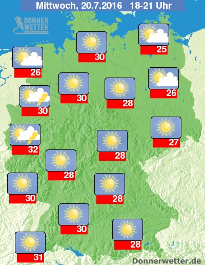 Heute Abend ziehen im Westen und Nordwesten von Deutschland oft dichte Wolken auf und gebietsweise bilden sich hier dann Schauer, örtlich sogar, zum Teil schwere Gewitter! Im großen Rest der Bundesrepublik scheint hingegen verbreitet die Sonne oder es ziehen auch mal lockere Wolkenfelder durch, dabei bleibt es jedoch trocken. Die Temperatur liegt bei 25 Grad auf Rügen und etwa 32 Grad in Bonn.
