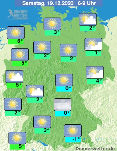 Der Samstag startet abseits von örtlichen Nebel- oder Hochnebelfelder verbreitet heiter oder es ist sonnig. Die Temperaturen erreichen am Alpenrand Werte um -1 Grad, am mildesten ist es mit Werten um 6 Grad in Ostfriesland.