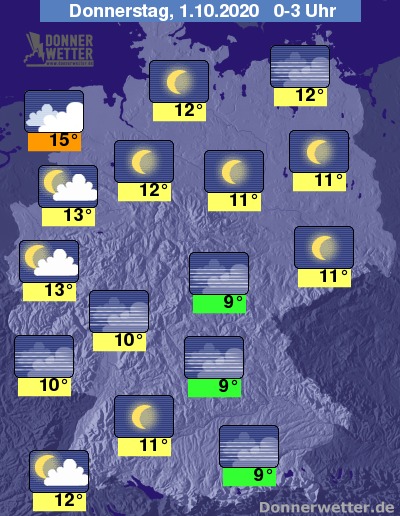 Während der zweiten Nachthälfte ziehen im Westen neue Wolken auf. Sonst leuchten zunächst verbreitet Mond und Sterne, bevor sich im weiteren Verlauf Nebelfelder bilden können.