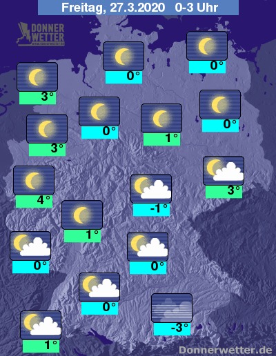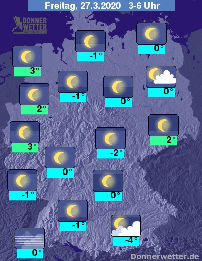 Die Temperaturen sinken in der Nacht auf Werte um 3 Grad auf den ostfriesischen Inseln und um -4 Grad am Alpenrand.