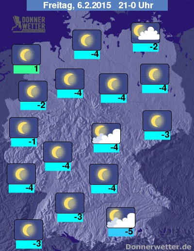 In der Nacht zum Samstag bleibt der Himmel vor allem nach Südwesten hin überwiegend sternenklar, sonst ziehen dagegen auch teils einige Wolken auf, die jedoch keine Niederschläge mit sich bringen. An den östlichen Mittelgebirgen bildet sich regional Nebel. Die Temperatur sinkt auf 1 Grad an der Nordseeküste und bis -9 Grad in Ingolstadt.