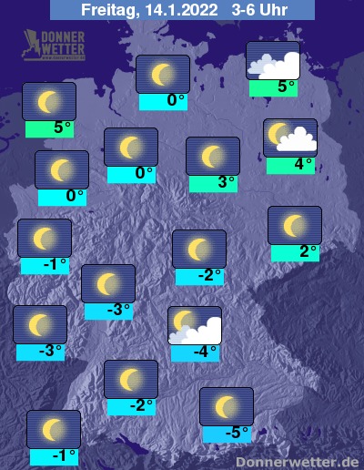 In der Nacht zum Freitag ist es verbreitet sternenklar, nur hier und da sind ein paar Wolken möglich. Mehr und teils dichte Wolken halten sich über dem Ostseeumfeld. Es bleibt bundesweit trocken bei Tiefstwerten von 5 Grad an den Küsten und bis -5 Grad in Oberbayern.