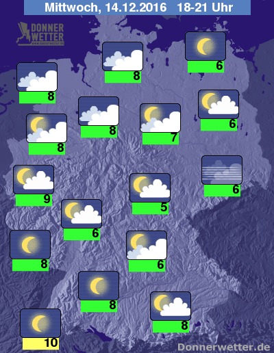Später am Abend ändert sich wettertechnisch nicht viel. Im Südwesten und entlang der Oder sternenklarer Himmel, ansonsten leicht bis starke Bewölkung. Entlang der Weser ein meist bedeckter Himmel. Im Nordwesten insgesamt mildere Temperaturen.