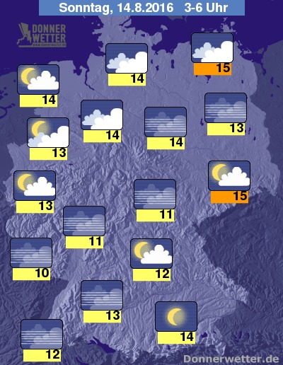In der folgenden Nacht ziehen über den Norden hier und da auch mal dichte Wolken hinweg, diese bringen jedoch keinen nennenswerten Regen. Vom Süden bis in die breite Landesmitte hinein zeigt sich der Nachthimmel verbreitet nur locker bewölkt oder sternenklar, dazu bleibt es trocken. Stellenweise bildet sich Nebel oder Dunst! Die Temperatur sinkt auf 15 Grad in Dresden und bis 10 Grad am Pfälzer Wald.