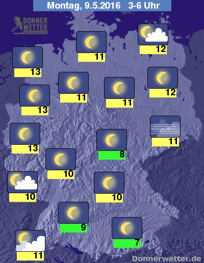 In der folgenden Nacht leuchten über dem Großteil der Bundesrepublik die Sterne von einem sehr klaren Himmel. Im Südwesten ziehen bis zum Morgen jedoch zunehmend mehr und auch teils dichte Wolken auf. Im Ostseeumfeld sind einige, jedoch aufgelockerte Wolken möglich. Es bleibt überall trocken bei Tiefstwerten von 13 Grad im Emsland und etwa 7 Grad im Raum München.