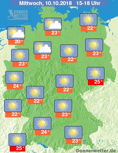 Am frühen Nachmittag werden die meisten von uns von der Sonne verwöhnt, lediglich über den Norden segeln einige Schleierwolken hinweg. Im Süden können sich regional noch einige zähe Nebelfelder oder auch hochnebelartige Wolken halten. Hier bleibt es dann auch am kühlsten. Im großen Rest klettern die Temperaturen jedoch verbreitet auf 20 bis 25 Grad. Etwas kühler bleibt es mit Werten von knapp unter 20 Grad auch in Ostfriesland.