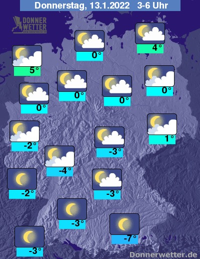 In der bevorstehenden Nacht zeigt sich der Himmel über Süddeutschland verbreitet sternenklar. Weiter nach Norden hin zieht überwiegend lockere bis aufgelockerte Bewölkung durch. Hier und da ist es auch stark bewölkt oder trüb. Es bleibt überall trocken bei Tiefstwerten von 5 Grad an der Nordsee und bis -7 Grad im Berchtesgadener Land.