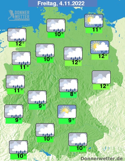 Am Freitag ist es oft stark bewölkt. Im Tagesverlauf sind aber auch einzelne Aufheiterungen möglich. Vor allem im Süden und Westen bilden sich gebietsweise Schauer. Die Temperatur steigt auf 8 Grad im Eichsfeld und bis 12 Grad im nördlichen Emsland. Im Norden herrscht oft stürmischer Wind, an den Küsten und auf den nördlichen Mittelgebirgen herrscht häufig Sturm.