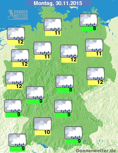 Am Montag bleibt der Himmel weitgehend bedeckt und es fällt auch häufig, gebietsweise auch langanhaltender und ergiebiger Regen, zudem weht ein oft stürmischer Wind, dabei sind auch im Flachland teils schwere Sturmböen möglich. Die Temperatur steigt auf recht milde 8 bis 12 Grad.