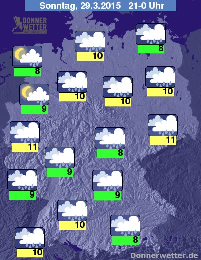 Heute Abend bleibt es weiterhin meist bedeckt, im westlichen Niedersachsen sind einige Auflockerungen und zudem längere Regenpausen möglich, sonst fällt verbreitet, teils langanhaltender und auch ergiebiger Regen. Die Abendtemperatur liegt bei 11 Grad in Köln und um 8 Grad an der Ostsee. Es weht oft starker, teils auch stürmischer Wind, dabei sind auch im Flachland Sturmböen möglich. Auf den Bergen und an den Küsten weht meist stürmischer Wind, dabei sind neben Sturmböen auch orkanartige Böen möglich.