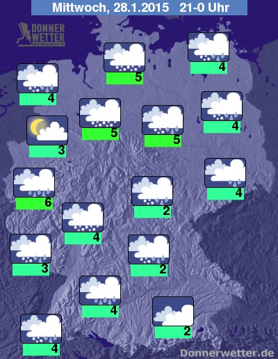 Heute Abend erstrecken sich fast über das ganze Land dichte Wolken mit teils kräftigem Schnee, Schneeregen oder Regen, dazu muss verbreitet mit Straßenglätte gerechnet werden. Im Nordwesten klart der Himmel im weiteren Verlauf oft wieder auf und es bleibt häufig trocken. Die Abendtemperatur liegt bei rund 6 Grad in Köln und um 2 Grad in München. Dazu weht ein vielfach frischer bis starker und in Böen stürmischer Wind, besonders auf den Bergen und an der See sind Sturmböen möglich. Achtung: Waldgebiete meiden.