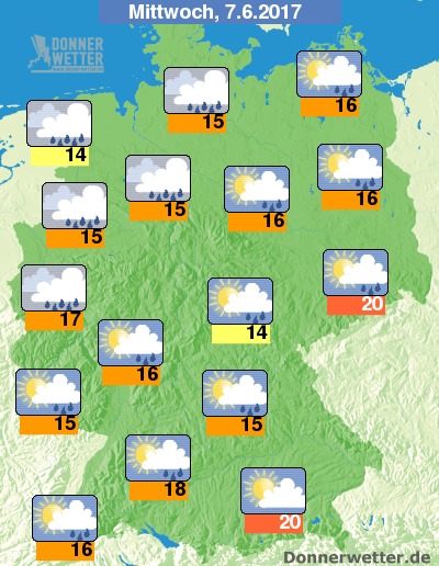 Am Mittwoch zeigen sich zum Teil heitere Abschnitte, teils ziehen aber auch dichte Wolken durch, dabei bilden sich gebietsweise Schauer, hier und da sind auch Gewitter möglich. Die Temperatur steigt auf 14 Grad in Cuxhaven und bis 20 Grad in München.