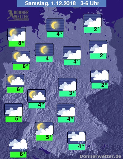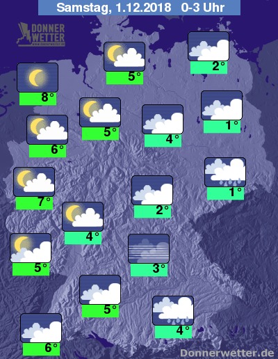 In der Nacht zeigt sich der Himmel über der Nordwesthälfte locker bewölkt oder es klart auf, der Südosten wird von einer meist geschlossenen Wolkendecke durch die nächsten Stunden begleitet. Einzelne Schauer fallen dabei vorwiegend im Erzgebirge sowie am Alpenrand, sonst bleibt es meist trocken.