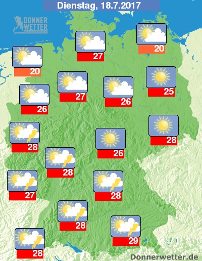 Am Dienstag zeigt sich das Wetter zum Großteil heiter oder sonnig, hier und da ziehen auch einige Wolken durch, dazu sind über der Südhälfte des Landes vereinzelte Schauer oder Gewitter möglich, sonst bleibt es aber trocken. Die Höchstwerte erreichen 20 Grad an den Küsten von Nord- und Ostsee und bis 29 Grad in Rosenheim.