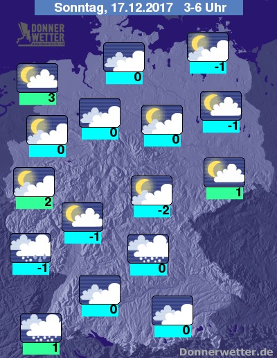 In der folgenden Nacht fällt im Süden unter weitgehend dichter Bewölkung gebietsweise Schnee oder Schneeregen, entsprechend können die Straßen teils sehr glatt sein! Weiter nach Norden hin ist es zum Teil stark, vor allem nach Osten hin aber auch oft nur gering bewölkt, hier bleibt es verbreitet trocken. Die Temperatur sinkt auf 3 bis -2 Grad.