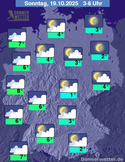 In der Nacht zum Sonntag nimmt die Bewölkung von Westen her immer weiter zu. Nach Osten hin ist es anfangs noch teils klar oder locker bewölkt. Zum Morgen hin zieht es sich aber auch hier mehr und mehr zu. Es bleibt landesweit trocken bei Tiefstwerten von 8 Grad in Köln und 1 Grad in Erfurt.