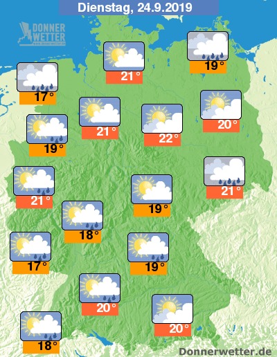 Die Tageshöchsttemperaturen liegen gemäß der Jahreszeit entsprechenden 16 bis 23 Grad, am wärmsten wird es dabei wohl im Lee-Bereich vom Harz.