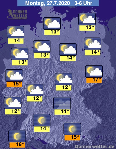 In der Nacht zum Montag zeigt sich der Himmel verbreitet nur locker bewölkt, südlich des Mains ist es sogar größtenteils sternenklar, dazu bleibt es trocken. Die Temperatur sinkt auf 17 Grad in Dresden und bis 12 Grad im Grabfeld.