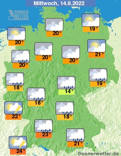 Am Mittwoch zeigt sich das Wetter im Norden teils heiter, teils stark bewölkt, dabei bilden sich einzelne Schauer. Im übrigen Land ziehen zumeist dichte Wolken durch und es bilden sich vielerorts Schauer, im Süden zudem örtliche Gewitter. Die Temperatur steigt auf 14 Grad im Vogtland und bis 24 Grad im Oberrheingraben.