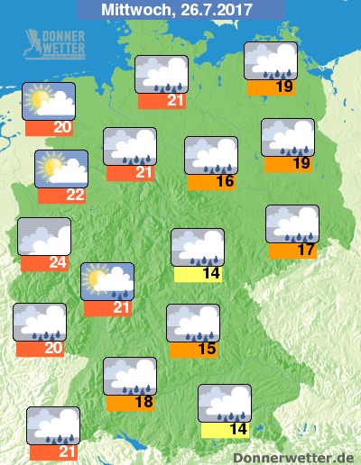 Von der Ostsee über die Landesmitte bis nach Bayern regnet es länger andauernd und zum Teil ergiebig weiter. Bei Regenmengen von örtlich wieder über 50 Liter pro Quadratmeter drohen neue Überflutungen. Im Westen, sowie im Nordosten bleibt es bis auf wenige Schauer trocken. Vor allem im Rheinland gibt es im Tagesverlauf größere Wolkenlücken mit kurzen sonnigen Phasen. Die Höchsttemperaturen liegen im Dauerregen bei kühlen 13 bis 16 Grad, sonst werden 17 bis 22 Grad erreicht. Mit sonniger Unterstützung sind am Niederrhein bis zu 25 Grad möglich. Der Wind kann gebietsweise böig auffrischen.