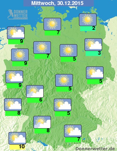 Heute ist es im Südwesten Deutschlands häufig stark bewölkt oder trüb, jedoch weitgehend trocken. Im großen Rest des Landes ist es dagegen verbreitet heiter bis sonnig, insbesonders über der Nordhälfte zeigt sich der Himmel über weite Strecken wolkenfrei. Die Temperatur steigt auf nur noch 2 Grad an der Müritz und bis 10 Grad im Breisgau. An Nord- und Ostsee weht ein teils starker Wind.