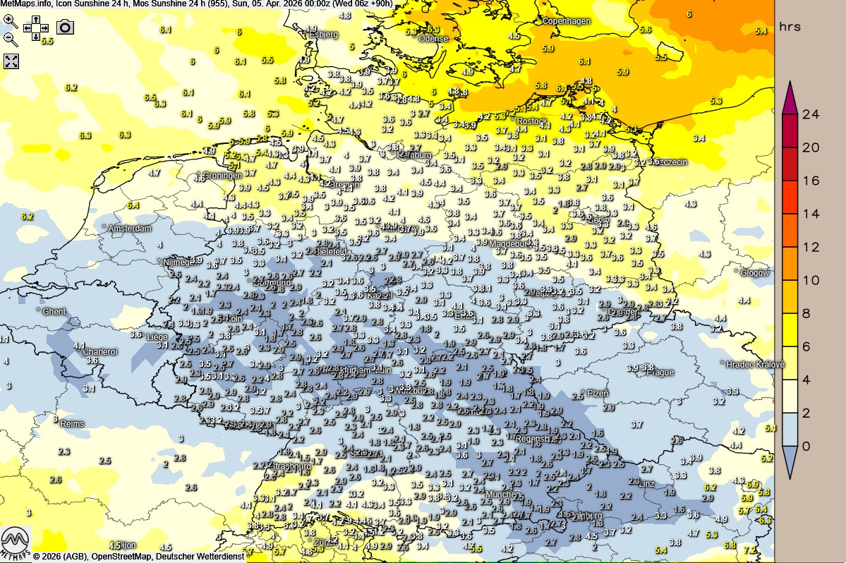 Die Wetter - und Temperaturkarte mit der 24-Stunden-Temperaturveränderung (12:00 Uhr / 15:00 Uhr) sowie die 24-Stunden-Sonnenscheindauer für Samstag nach ICON: