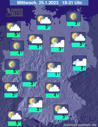 In der Nacht zum Donnerstag zieht nordwestlich einer Linie vom Rheinland bis Schleswig-Holstein kompakte Bewölkung mit Schnee, Schneeregen oder Regen auf. Südöstlich davon ist es meist stark bewölkt. Vor allem im Süden, aber auch im Ostseeumfeld ist es auch häufig nur leicht bewölkt, dazu bleibt es trocken. Die Temperatur sinkt auf 3 Grad in Wilhelmshaven und -5 Grad in Augsburg.