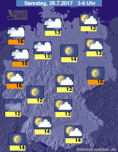 In der Nacht zum Samstag ziehen dichte Wolken mit Regen über das nördliche NRW, Niedersachsen, Schleswig-Holstein und zum Morgen hin auch über den Nordosten der Republik hinweg. In den anderen Landesteilen zeigt sich der Himmel dagegen oft nur locker bewölkt oder sogar sternenklar, dazu bleibt es trocken. Die Temperatur sinkt auf 16 Grad in der Kölner Bucht und bis 12 Grad im Saargau.