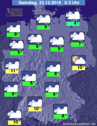 In der Nacht auf Samstag bleibt der Himmel über weiten Landesteilen dicht bewölkt oder bedeckt, vereinzelte Auflockerungen sind im Verlauf im Süden und Südosten möglich. Vor allem im Norden Deutschlands muss in der Nacht mit zum Teil kräftigem Regen gerechnet werden, in den übrigen Regionen bleibt es überwiegend trocken oder es fallen nur vereinzelte Schauer. Weiterhin weht ein mäßiger bis frischer, örtlich auch noch stürmischer Wind aus West.