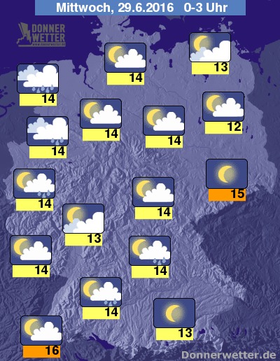 Im weiteren Nachtverlauf zeigt sich der Himmel über Deutschland meist locker oder aufgelockert bewölkt, über dem Erzgebirge kann es auch aufklaren. Mit Schauern muss vor allem zwischen Niederrhein und Hunsrück sowie vereinzelt im Süden gerechnet werden.