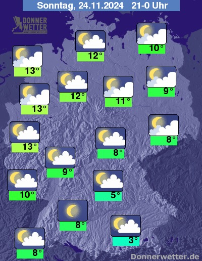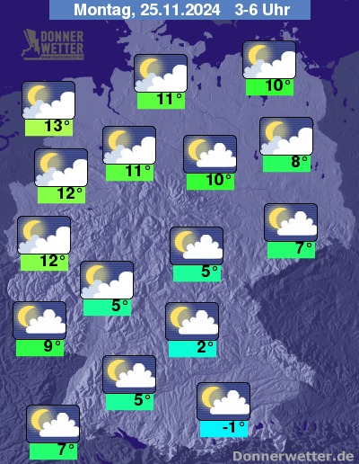 Die Temperaturen gehen in den Frühstunden zurück auf Werte um 13 Grad im äußersten Nordwesten, 8 Grad an der Spree und -1 Grad am Alpenrand.