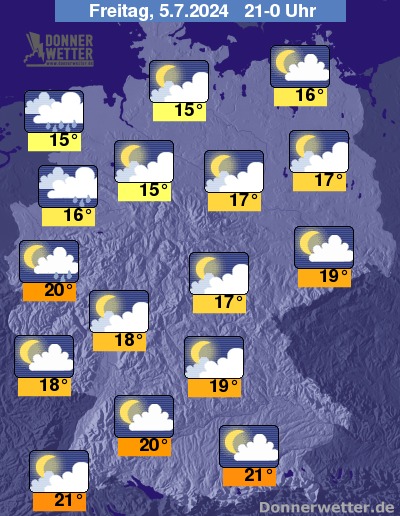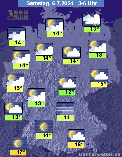 In der Nacht zum Samstag fällt im Norden bei starker Bewölkung gebietsweise schauerartiger Regen; in den übrigen Landesteilen ist es teils wolkig, teils gering bewölkt und es bleibt weitgehend trocken. In den südlichen Landesteilen ist es auch sternenklar.