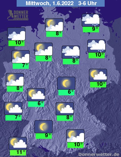 In der Nacht auf Mittwoch sind in der Nordhälfte noch einzelne Schauer und Gewitter möglich. Auch am Alpenrand können anfangs noch ein paar Tropfen fallen. In den übrigen Landesteilen lockern die Wolken im Nachtverlauf häufig auf, teils ist es auch sternenklar, und es bleibt meist trocken.