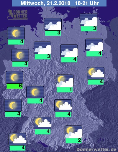In den Abendstunden bleibt der Himmel zwischen Weser und Oder meist dicht bewölkt oder bedeckt, Schauer sind aber nicht zu erwarten. Zwischen Ostfriesland und dem Saarland ist der Himmel klar, im Südosten überwiegt lockere oder aufgelockerte Bewölkung.