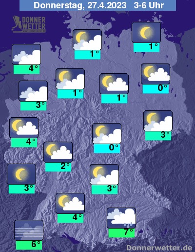 In der folgenden Nacht fällt an den bayerischen Alpen unter dichten Wolken gebietsweise Regen. Direkt an der Nordsee bringen dichte Wolken mögliche Schauer. Im übrigen Land bleibt es trocken und der Himmel zeigt sich verbreitet locker bis aufgelockert, im Nordwesten auch dicht bewölkt. Im Südwesten ist es oft sternenklar. Die Temperatur sinkt auf 7 Grad in München und bis 0 Grad in Jena.