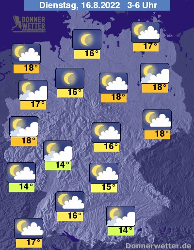 In der kommenden Nacht bilden sich anfangs im Nordosten noch gebietsweise Schauer und örtliche Gewitter, sonst ist es verbreitet locker bis aufgelockert bewölkt und im Nachtverlauf auch zunehmend sternenklar, dazu bleibt es weitgehend trocken. Die Temperatur sinkt auf 18 Grad in der Lausitz und bis 14 Grad im Saargau.