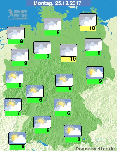 Am 1. Weihnachtsfeiertag bleibt der Norden dicht bewölkt, hier sind vereinzelte Tropfen möglich. Besonders im Süden, jedoch auch über dem übrigen Land scheint hingegen immer wieder auch mal die Sonne, dabei bleibt es trocken. Die Temperatur steigt auf 6 bis 10 Grad.