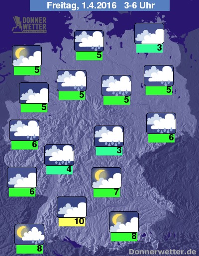 In der folgenden Nacht fällt vor allem über der breiten Mitte des Landes häufig Regen, aber auch im äußeren Südwesten und im Norden kann gebietsweise etwas Regen fallen. Im übrigen Bundesgebiet bleibt es bei meist starker, selten auch aufgelockerter Bewölkung weitgehend trocken. Die Temperatur sinkt auf 10 Grad in Stuttgart und bis 3 Grad im Vogtland.