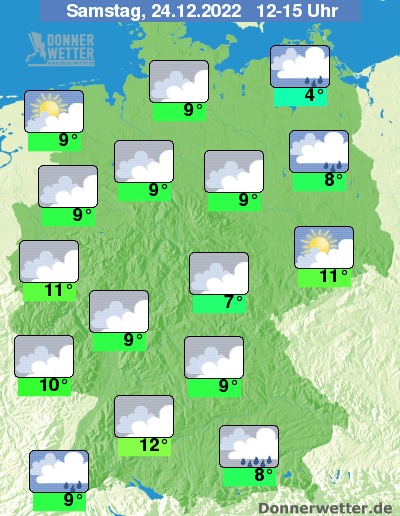 Am Heiligen Abend bleibt es überwiegend bei den dichten Wolken, vor allem im Norden kann es jedoch hier und da auch auflockern. Im Süden fällt dazu zeitweise Regen, während es im übrigen Land trocken bleibt. An den Küsten und vor allem an der Nordsee weht ein oft stürmischer Wind.