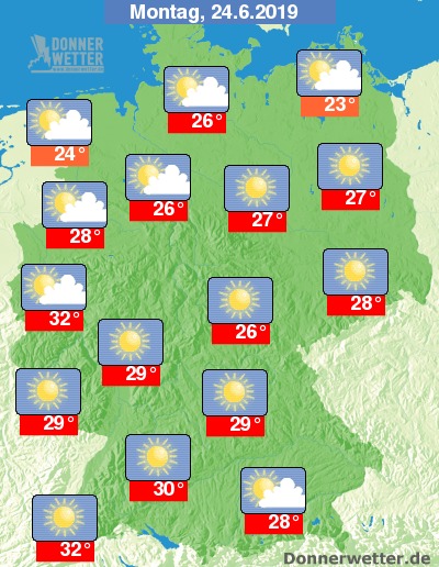 Am Montag wird es den Tag über verbreitet sonnig und trocken. An den Küsten ziehen hier und da, sonst nur selten lockere Wolken durch. Die Temperatur steigt auf 23 Grad in Rostock und bis 32 Grad in Düsseldorf.