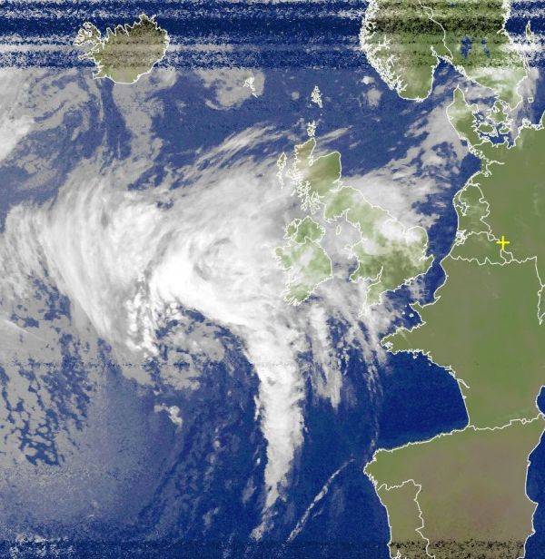 Auf dem Satellitenfoto von heute Morgen zeigt sich westlich der Britischen Inseln im Atlantik ein kräftiges Sturmtief. Es sorgt mit seinen Ausläufern für verbreitet wechselhaftes und kühles Schauerwetter in weiten Teilen von Großbritannien, vor allem über Irland weht dazu ein oft stürmischer Wind.