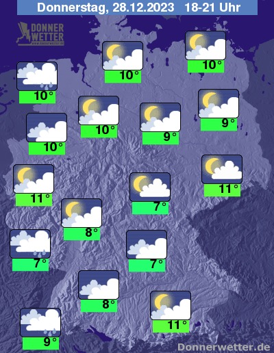 In der Nacht zum Freitag zieht der Regen vom Nordwesten weiter südostwärts bis in den übrigen Norden und Westen Deutschlands, dazu bleibt es bedeckt. Im übrigen Land ist es meist stark, teils aufgelockert bewölkt und weitgehend trocken. Die Temperatur sinkt auf 10 Grad in Köln und bis 6 Grad in Jena. Über der Nordhälfte des Landes weht ein frischer bis starker, an der See teils stürmischer Wind, hier sind vielerorts schwere Sturmböen, vereinzelt auch orkanartige Böen zu erwarten.