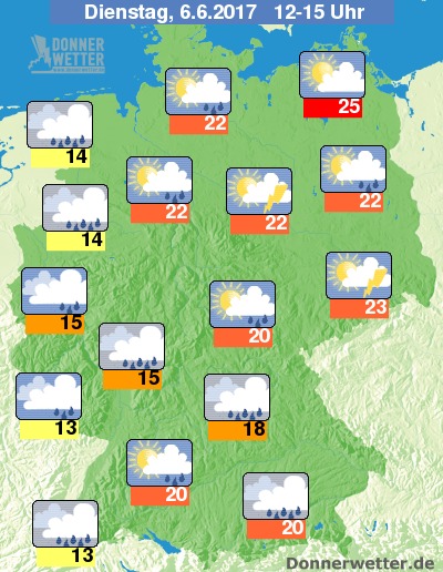 Heute Nachmittag ist der Himmel über der Westhälfte weitgehend bedeckt, hier fällt immer wieder, zum Teil auch langanhaltender Regen. Weiter nach Osten hin ziehen auch oft kompakte Wolken durch, teils sind aber auch Auflockerungen möglich, dazu bilden sich wiederholt Schauer und örtlich teils kräftige Gewitter. Die Temperatur liegt bei frischen 13 Grad im Saargau und bis 25 Grad in Rostock.
