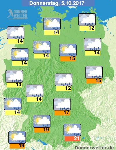 Mit kräftig auffrischendem Wind zieht ein Regengebiet über Deutschland hinweg. Es kann teilweise ziemlich schütten. Vor allem in Norddeutschland, sowie über den Mittelgebirgen drohen außerdem schwere Sturmböen bis orkanartige Böen mit Tempo von über 100 Stundenkilometern. Der Wind dreht im Tagesverlauf von Südwest auf West bis Nordwest. Am längsten freundlich und trocken bleibt es über Süddeutschland. Dort setzt der Regen erst gegen Abend ein. Hinter dem Regenband stellen sich nachmittags in Norddeutschland größere Aufheiterungen mit einzelnen Schauern ein. Die Höchsttemperaturen liegen zwischen 12 und 19 Grad. Ganz im Süden können sogar 20 Grad überschritten werden.