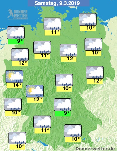 Heute ziehen überwiegend dichte Wolken durch, dabei fällt zeitweise Regen, über der Nordhälfte treten zusätzlich häufig Schauer und örtlich auch kurze Gewitter auf. Die Temperatur steigt auf 9 Grad in Oberfranken und bis 14 Grad in der Kölner Bucht. Es weht ein teils stürmischer Wind, an den Küsten herrscht oft Sturm.