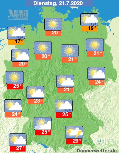 Heute Abend zeigt sich das Wetter größtenteils heiter bis sonnig. Einzelne Schauer und lokale Gewitter können sich jedoch bevorzugt noch im Osten und Süden bilden, sie klingen aber auch hier im Verlauf ab. Die Temperatur liegt bei kühlen 18 Grad in Wilhelmshaven und bis 29 Grad in Stuttgart.