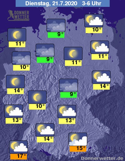 In der Nacht zum Dienstag ist es im Süden teils klar, teils aufgelockert bewölkt und dazu bis auf ganz vereinzelte Schauer trocken. Im übrigen Bundesgebiet ist es verbreitet sternenklar oder es ziehen nur lockere Wolkenfelder durch, dabei bleibt es trocken. Die Temperatur sinkt auf milde 17 Grad im Oberrheingraben und bis 9 Grad in der Norddeutschen Tiefebene.