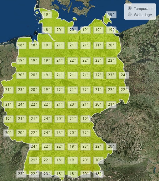 Dazu liegen die Höchsttemperaturen im ganzen Land bei Werten um die 20 Grad. Etwas kühler bleibt es mit maximal 18 Grad nur an den Küsten und am Alpenrand. In der Kölner Bucht und in Nordbaden sind hingegen bis zu 24 Grad möglich.