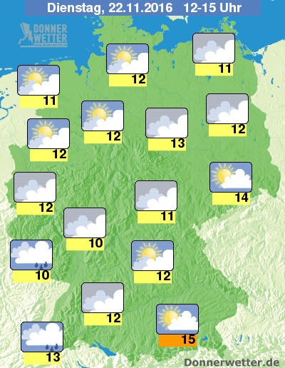 Heute Nachmittag ziehen über den Südwesten Deutschlands verbreitet dichte Regenwolken hinweg, auch sonst zeigt sich das Wetter in weiten Teilen des Landes stark bewölkt, jedoch dazu weitgehend trocken. Die größten Chancen für Auflockerungen bestehen im Osten, Südosten und auch über Teilen von Niedersachsen und Schleswig-Holstein. Die Temperatur liegt bei recht milden 10 bis 15 Grad.